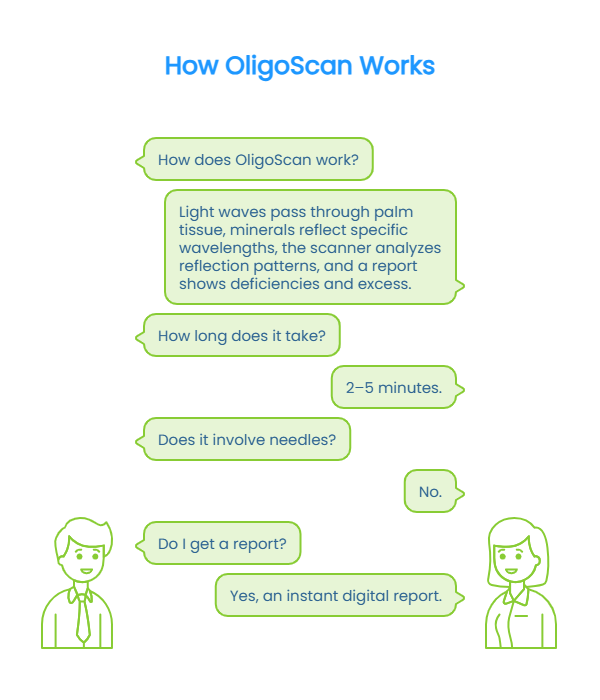 2025-10-20 Many health problems don’t begin with disease—they start quietly with mineral depletion, poor absorption, or toxic overload. Headaches, fatigue, skin issues, or muscle cramps are often brushed off as “normal stress,” especially in urban lifestyles. The OligoScan test helps detect these imbalances early, before they escalate into chronic conditions. Oligo Scan uses advanced light-based technology to assess minerals and heavy metals at the tissue level, offering insights that routine blood tests may miss. In 2026, early detection is becoming central to preventive and longevity-focused healthcare, particularly in high-stress, high-pollution environments. At Longevity & Beyond Clinics, OligoScan is used as an early-warning tool—helping individuals understand what their body lacks or accumulates long before symptoms become diagnoses. The OligoScan test is a non-invasive diagnostic assessment that measures essential minerals, trace elements, and toxic heavy metals stored in body tissues. Unlike blood tests that reflect short-term circulation, OligoScan shows what your cells have actually absorbed over time. The test is painless, radiation-free, and takes only a few minutes. A handheld scanner is placed on specific points of the palm, where light reflection helps identify mineral deficiencies or toxic overload. Key components measured include minerals such as magnesium, zinc, calcium, iron, selenium, and potassium, along with heavy metals like mercury, lead, aluminium, cadmium, and arsenic—elements increasingly relevant due to modern diets, pollution, and lifestyle stressors. Frequent headaches: Often linked to magnesium deficiency or toxic burden Unexplained fatigue: Despite rest or normal blood reports Numbness or tingling in hands and feet: May indicate mineral imbalance or nerve stress Muscle cramps or stiffness: Common with low magnesium, potassium, or calcium Skin issues: Acne, dullness, or delayed healing can reflect zinc or selenium deficiency These symptoms are early signals—not conditions to ignore. Dietary deficiencies: Processed foods, low protein intake, restrictive diets Environmental exposure: Air pollution, contaminated water, heavy metals in food Lifestyle factors: Chronic stress, poor sleep, excessive caffeine, smoking, sedentary habits If multiple factors apply, OligoScan can offer clarity. OligoScan is based on spectrophotometry, where safe light wavelengths interact with tissue minerals. Each mineral and metal reflects light uniquely. The scanner captures this reflection and compares it against reference values. Results are presented in an easy-to-understand, color-coded report showing deficiencies, optimal ranges, or excesses. However, interpretation matters. Numbers alone don’t heal—context does. Clinicians correlate results with symptoms, diet, lifestyle, and health history to create meaningful action plans. Early detection allows preventive correction instead of reactive treatment. Identifying mineral depletion early can support energy, hormonal balance, immunity, and cognitive health. OligoScan also enables personalized strategies—targeted nutrition, supplementation only where needed, detox support when required, and lifestyle adjustments that actually work. Over time, this approach supports long-term wellness and healthy aging, reducing the risk of chronic fatigue, metabolic slowdown, and inflammation-driven conditions. Preparation: Avoid supplements and heavy skincare products on hands for 24 hours if advised. Stay normally hydrated. Duration & process: The scan takes 2–5 minutes. No needles, no pain, no downtime. Post-test follow-up: Results are discussed with a healthcare professional, followed by a personalized plan—nutrition, lifestyle, or further testing if required. Early signs like fatigue, headaches, cramps, or skin changes are your body’s way of asking for attention. The OligoScan test helps decode these signals early—before they become chronic problems. If you want clarity beyond routine reports and a preventive approach aligned with 2026 healthcare, consult trained professionals who can interpret OligoScan results meaningfully and guide you toward sustainable wellness. It measures mineral levels and heavy metals in body tissues to identify imbalances affecting health. Avoid supplements and certain topical products 24 hours prior, if advised, for accurate results. Frequent headaches, fatigue, numbness, muscle cramps, and skin issues can be early indicators. Frequency varies by individual; consult a healthcare provider for personalized guidance. Yes. It is non-invasive, painless, and has no known side effects. Expert team focused on preventive and integrative health Advanced, non-invasive diagnostics Personalized wellness plans based on root-cause insights Preventive Health Services Nutritional CounselingIntroduction to OligoScan